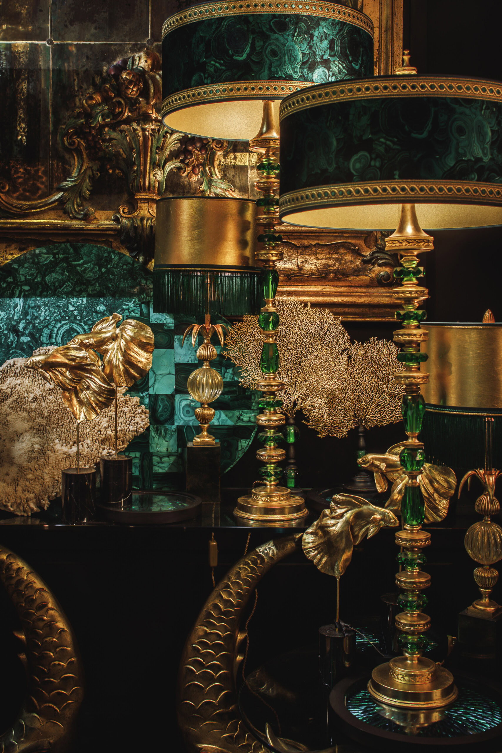 Emerald green, one of our absolute favourite colours. Especially in crystal, it provides an amazing twist of the light. Each lamp and shade could be made custom made and according to your own wishes. Contact us and we can tell you about all the possibilities.